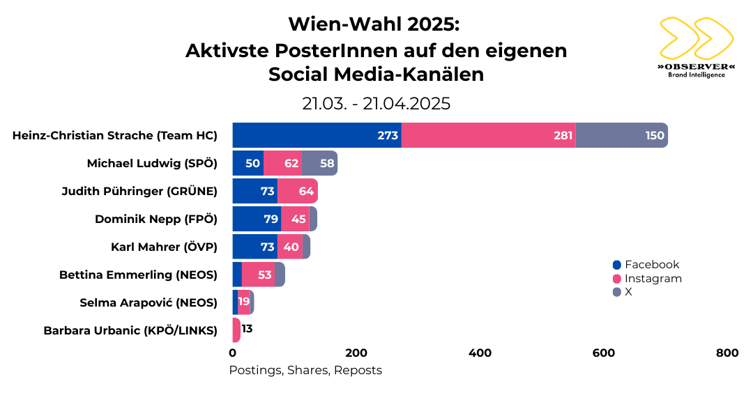 »OBSERVER« hat weiters untersucht, wer von den acht MitstreiterInnen auf Social Media (Facebook, Instagram und X) am aktivsten war. Heinz-Christian Strache, der mit seiner Liste „Team HC“ bei der Wahl antritt, hat auf allen Kanälen fast sechsmal so viele Postings (704) verfasst und geteilt wie seine Konkurrenz. Dahinter schaffen es Michael Ludwig (170 Postings) und Judith Püringer (138 Postings) auf den zweiten und dritten Platz. Am häufigsten posteten alle KandidatInnen auf Facebook, während sie auf X – mit Ausnahme von HC Strache – kaum präsent waren. Barbara Urbanic (KPÖ) ist mit einem eigenen öffentlichen Kanal nur auf Instagram vertreten.